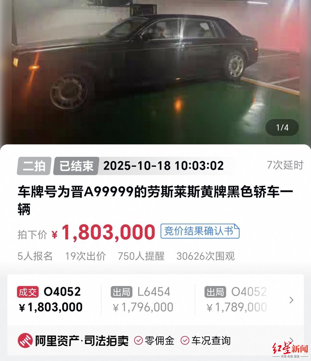 10月17日,山西省阳泉市中级人民法院通过司法拍卖平台拍卖了一辆黄牌黑色劳斯莱斯轿车。 18日拍卖结束,经过19次竞价,劳斯莱斯幻影最终以180.3万元的价格被竞拍者成功拍卖。 ▲ 拍卖平台截图。拍卖平台信息显示,这是一辆2006款劳斯莱斯幻影6.7L加长版EWB自动大型轿车,车牌号金A99999。它用于非操作目的。该车续航里程为7.79万公里。 2009年2月登记,年检有效期至2026年2月,车辆违法状况已处理。据悉,由于该车车长超过6米,驾驶员必须持有A1驾驶执照。该车预估售价为193万元。本次拍卖起拍价为154.4万元,保证金15万元,成交价15万元。大米增加7000元(及其整数倍)。值得注意的是,本次拍卖仅涉及车辆,车牌号不参与拍卖。红星新闻记者注意到,共有5人报名参加标的拍卖,吸引了3万余人次观看。拍卖平台信息显示,10月17日拍卖开始当天,无人竞拍。直到10月18日上午9点17分,距离拍卖结束还不到一个小时,竞拍号“O4052”率先出价。随后,竞拍编号“L6454”也开始竞拍。经过两人多次竞价,竞价编号“O4052”最终以180.3万元的价格成功购买了劳斯莱斯幻影。 ▲ 竞拍成功确认书 随后公布的《网上竞拍成功确认书》显示,10月18日10时03分,姓左的用户以最高出价中标,竞拍编号为“O4052”,拍卖成交售价为180.3万元。红星新闻记者王超主编:熊世华发言请遵守新闻评论服务协议